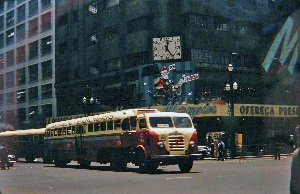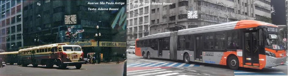 Comparação do Papa-Filas de 1960 com o atual ônibus articulado, no mesmo local, no centro de São Paulo. Imagem: Adamo Bazani - Diário do Transporte