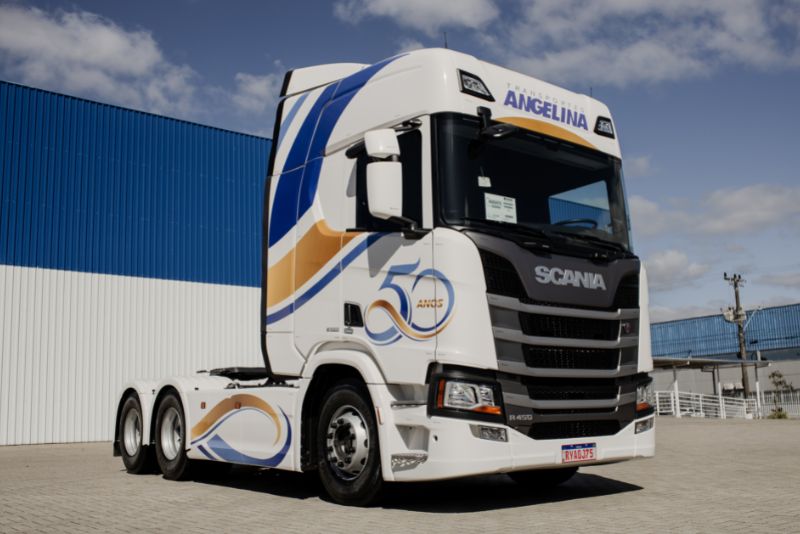 Ao completar 50 anos de história, a Transportes Angelina recebeu da Scania um caminhão R450 especial comemorativo, uma placa de homenagem e uma miniatura customizada. Na cor branca, com detalhes em azul e dourado, para fazer jus à cor das bodas de ouro.