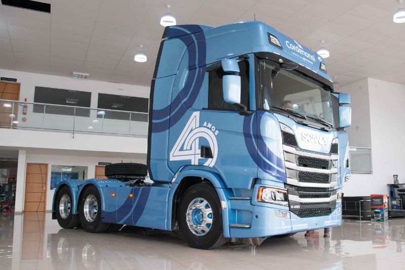 Com uma pintura especial, na cor azul oceano, este caminhão foi pensado para comemorar os 40 anos da Cordenonsi. Na ocasião da entrega, o cliente também recebeu uma placa de homenagem e uma miniatura exclusiva.