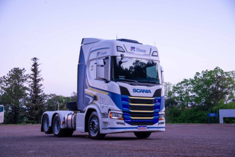 Mais uma celebração de bodas de ouro, desta vez, da Tombini. Os detalhes dourados revelam o motivo da celebração e se unem ao tradicional azul da marca. O caminhão se destaca entre os demais da frota, pelo seu design especial e justamente pelos traços personalizados, que lembram ouro.