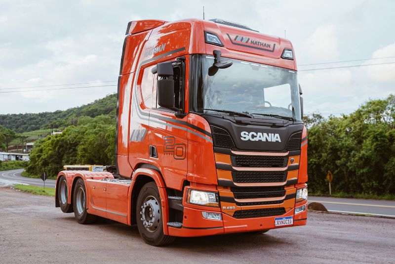 A Transportes Nathan celebrou suas bodas de porcelana com um caminhão R 450 especial comemorativo. Na cor laranja, esse caminhão especial certamente será uma atração à parte na frota da empresa e nas estradas do Brasil, em comemoração aos vinte anos de história.