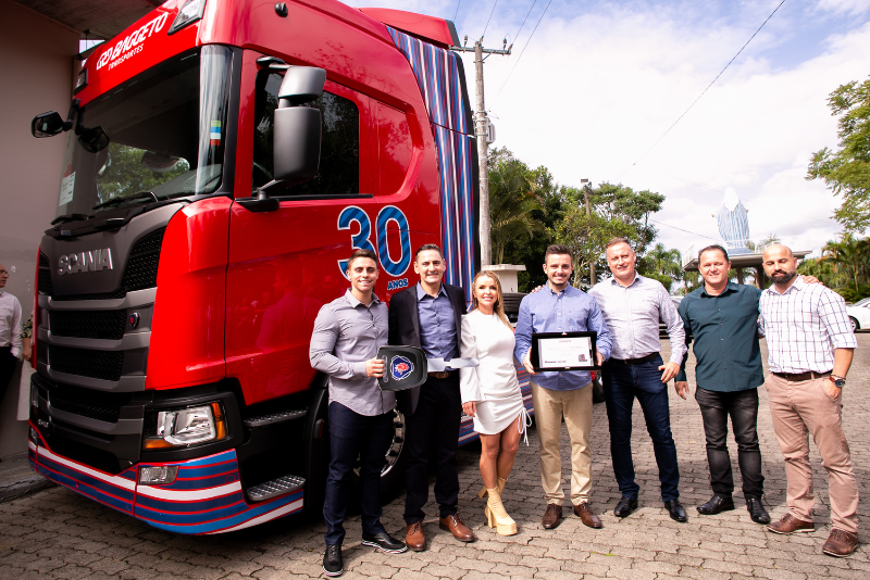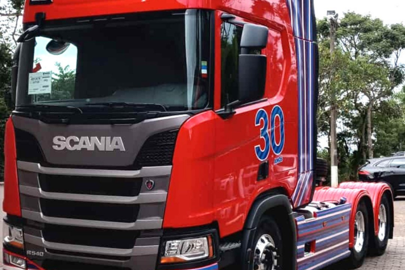 Bodas de pérola: é esse o motivo da comemoração e da entrega desse caminhão exclusivo da Transportes Baggetto. A empresa completou 30 anos de história e recebeu o Scania R 540 totalmente personalizado, com a cor vermelha tradicional dos demais caminhões da frota, mas com um design especial e com detalhes em azul, fazendo uma referência às cores da empresa, bastante conhecida na região de Santa Catarina.