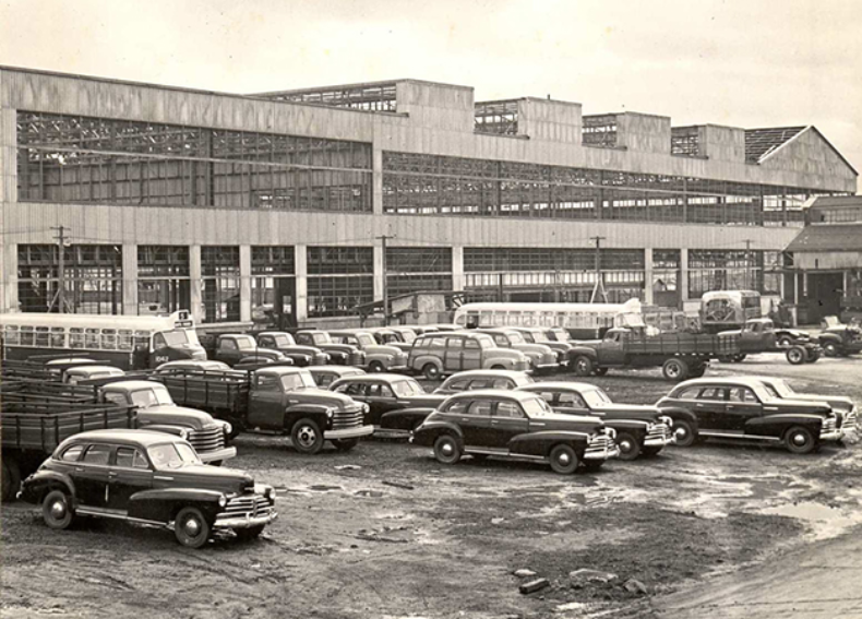 Pátio da fábrica da General Motors do Brasil em 1948, ainda não concluída, com uma amostra de sua produção na época: ônibus e caminhonetes com carrocerias nacionais – metálicas e de madeira, caminhões com cabines já fabricadas no Brasil e automóveis Chevrolet aqui montados (fonte: site felipebitu).