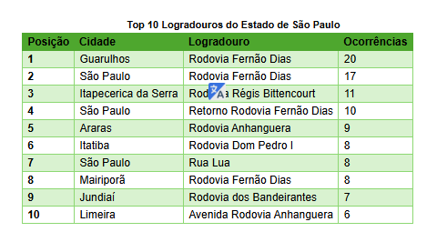 O estudo mapeou as vias mais perigosas. Há uma predominância de rodovias entre os logradouros mais afetados. A Rodovia Fernão Dias, que conecta a capital paulista ao sul de Minas Gerais, aparece em três posições distintas — em Guarulhos, São Paulo e Mairiporã —, evidenciando sua importância estratégica e vulnerabilidade para ações criminosas.
