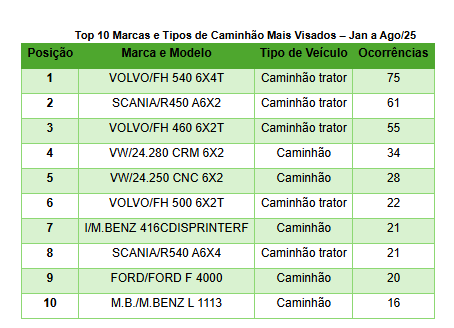 Fernão Dias, Régis Bittencourt e Anhanguera são as vias com mais eventos. Os modelos Volvo FH e Scania Série R, geralmente usados em transporte de longa distância e operações logísticas de alto valor, concentraram o maior número de ocorrências